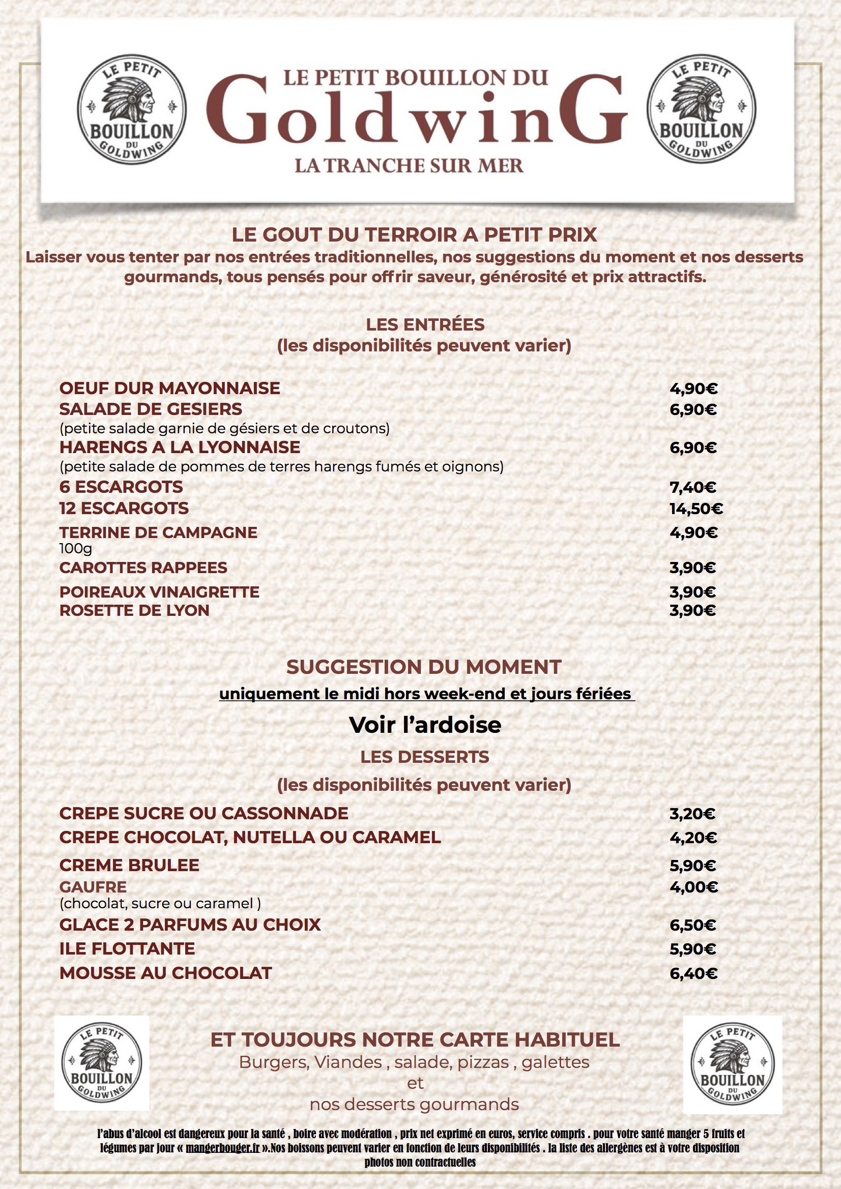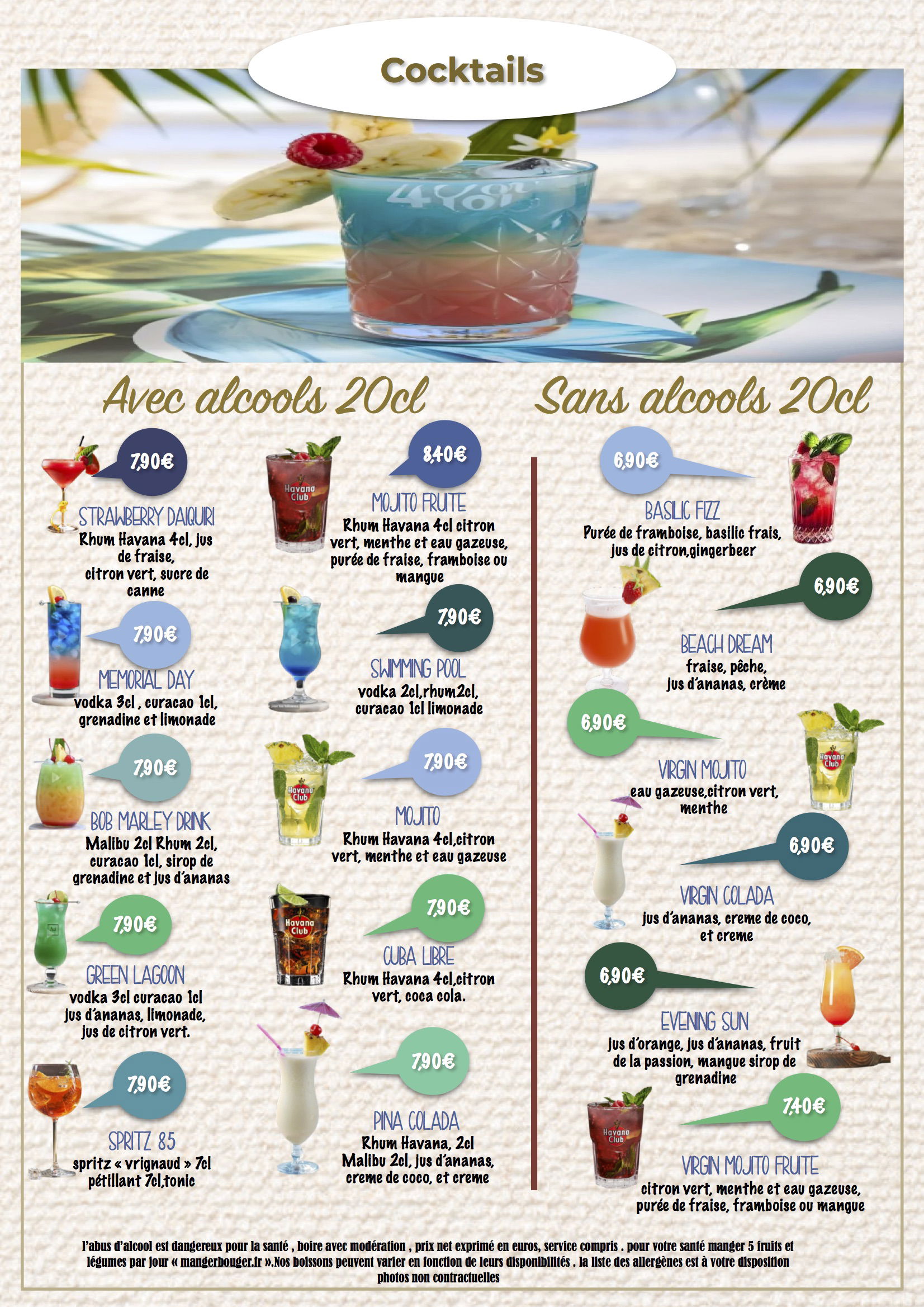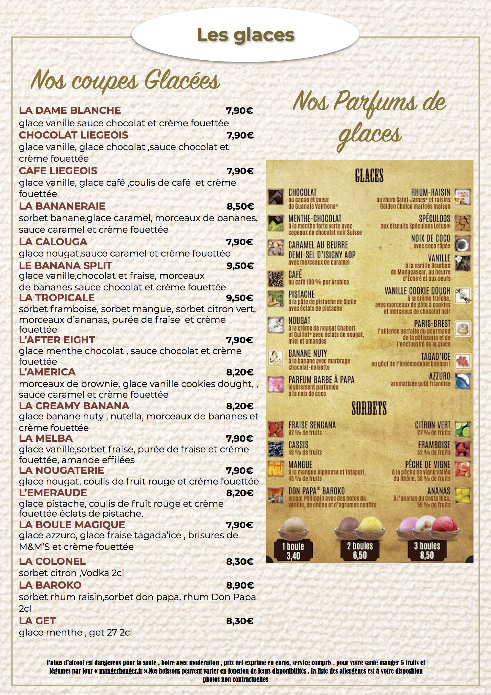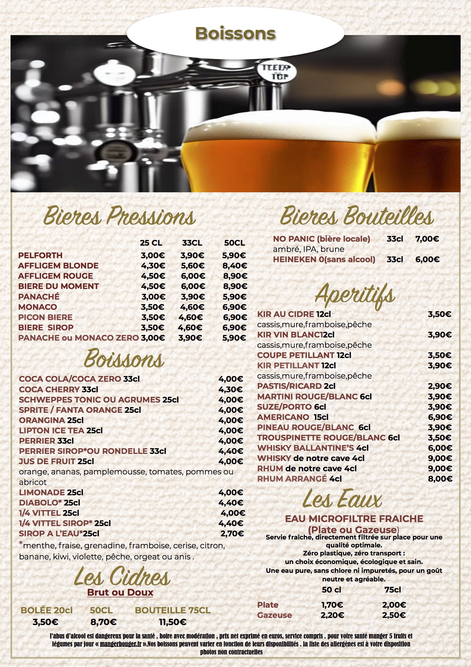 Prix net exprimé en euros, service compris, l'abus d'alcool est dangereux pour la santé, à boire avec modération, éviter de grignoter entre les repas, manger 5 fruits et légumes par jour.