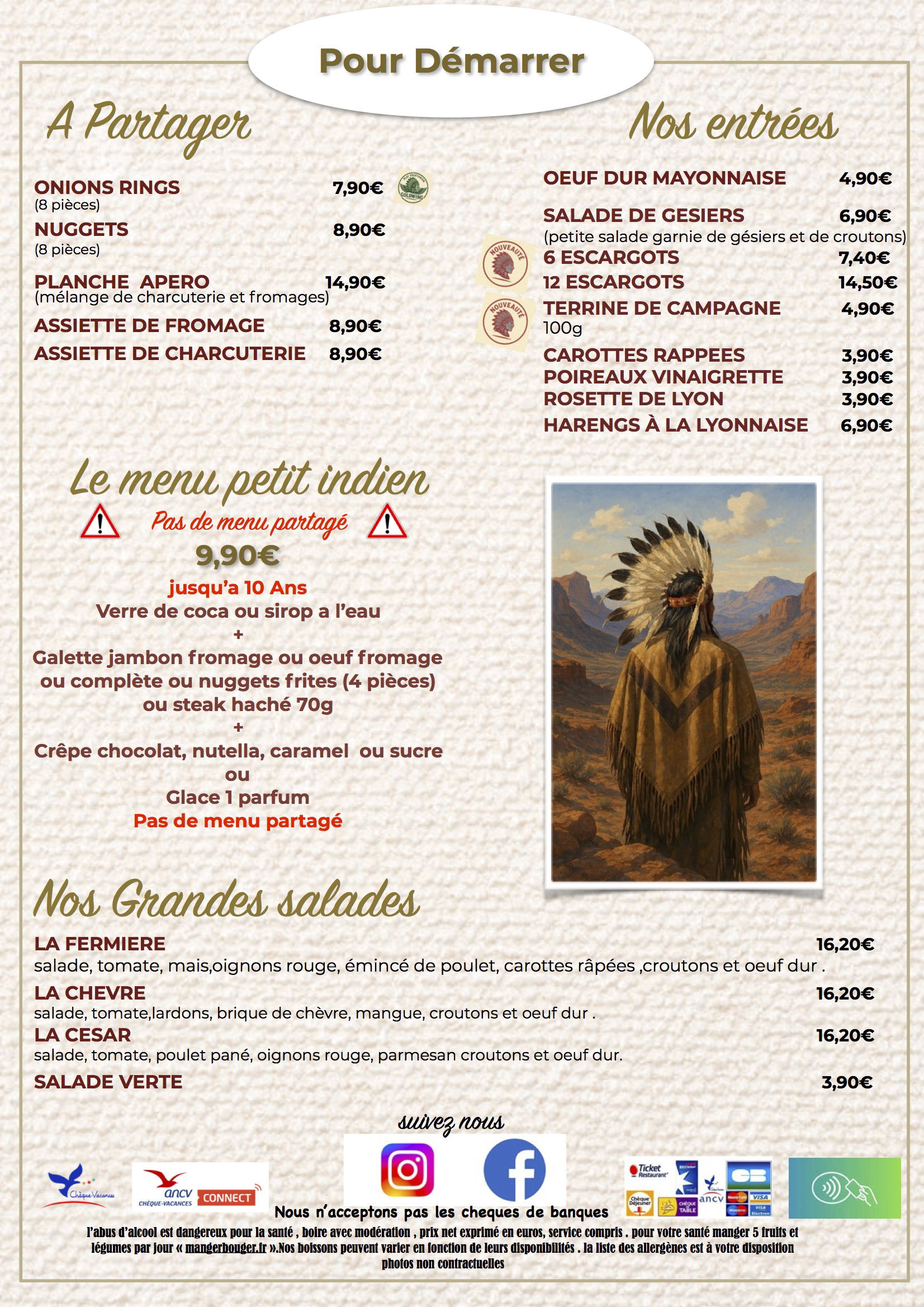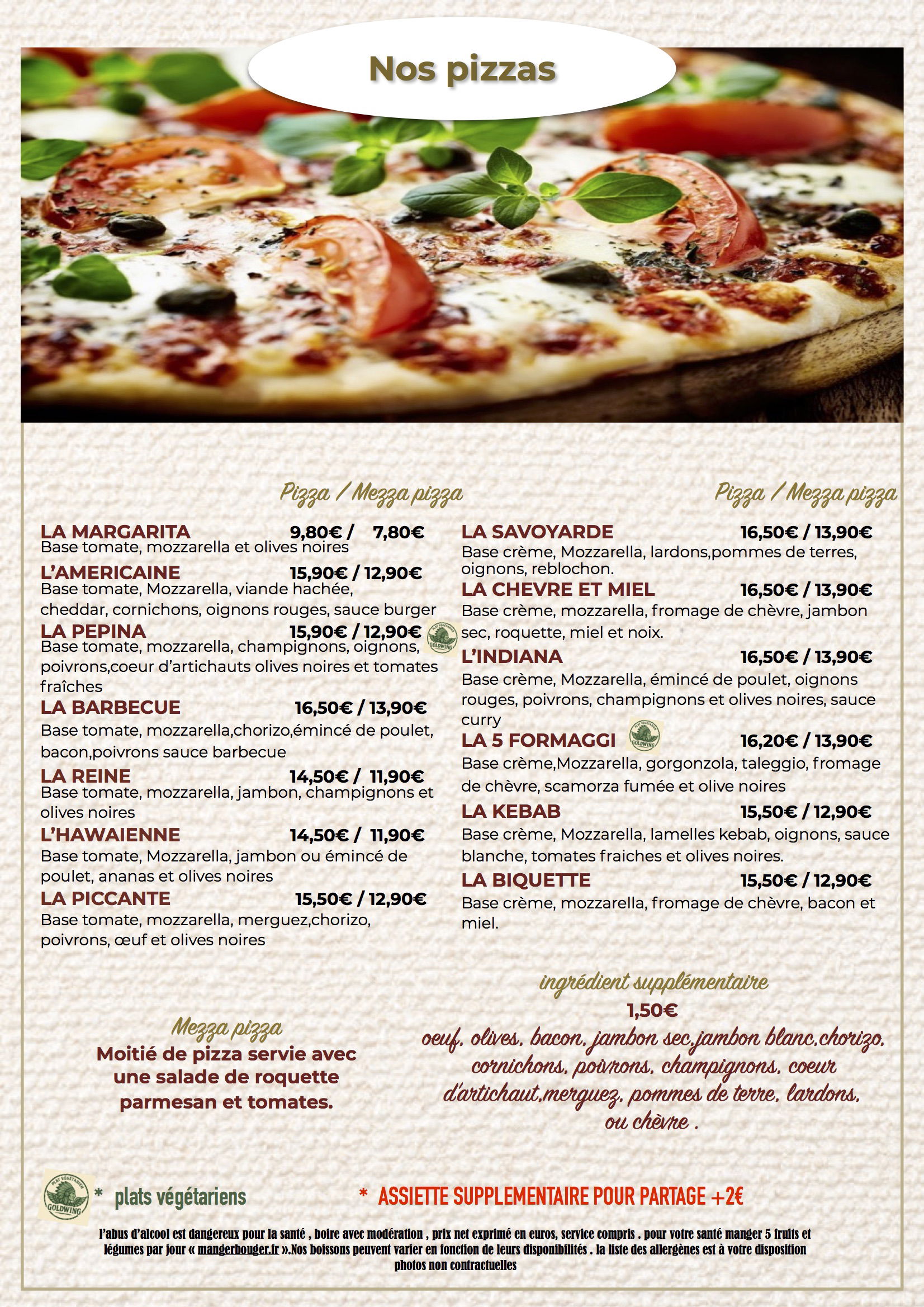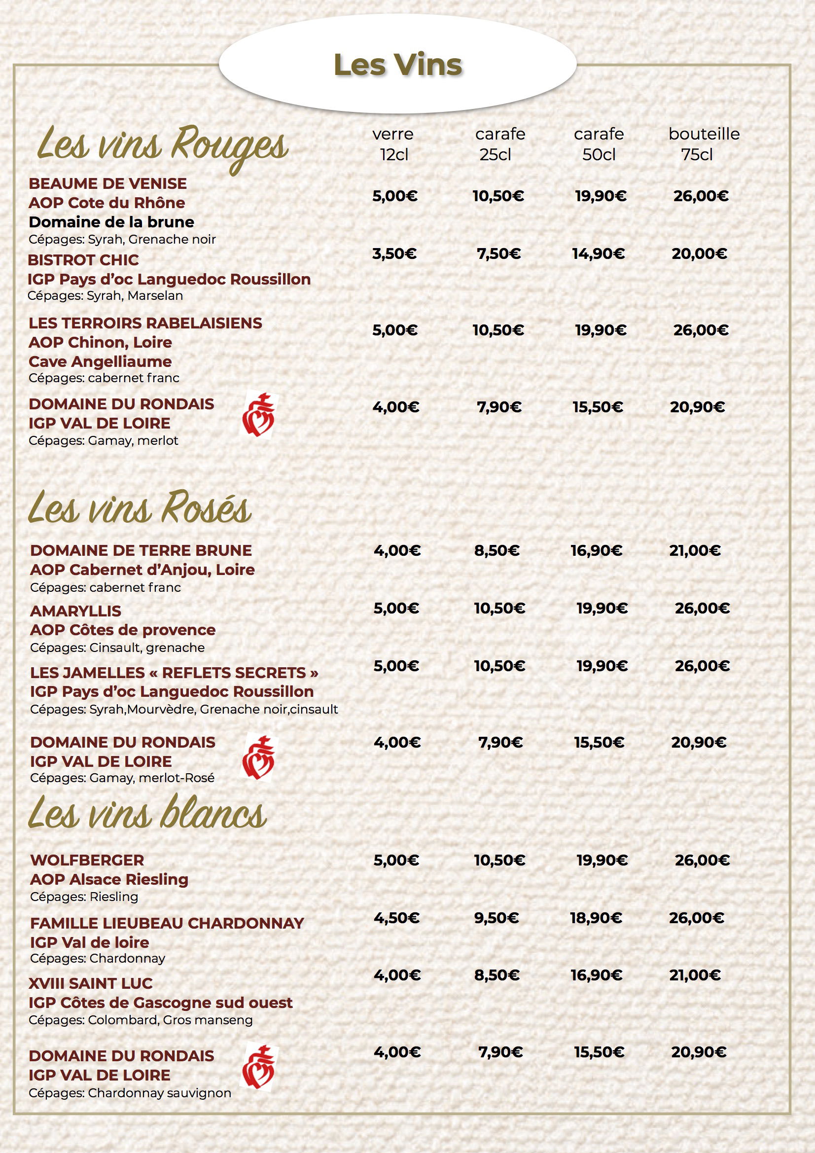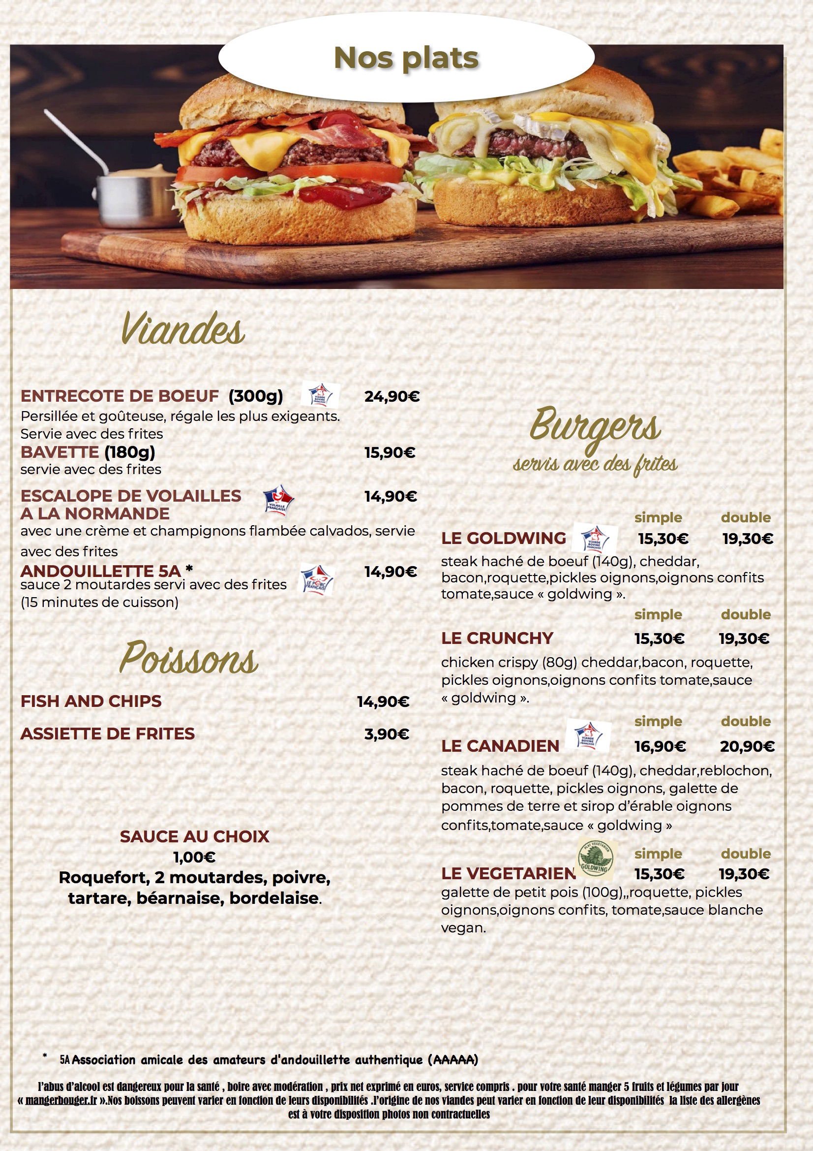 Prix net exprimé en euros, service compris, l'abus d'alcool est dangereux pour la santé, à boire avec modération, éviter de grignoter entre les repas, manger 5 fruits et légumes par jour.